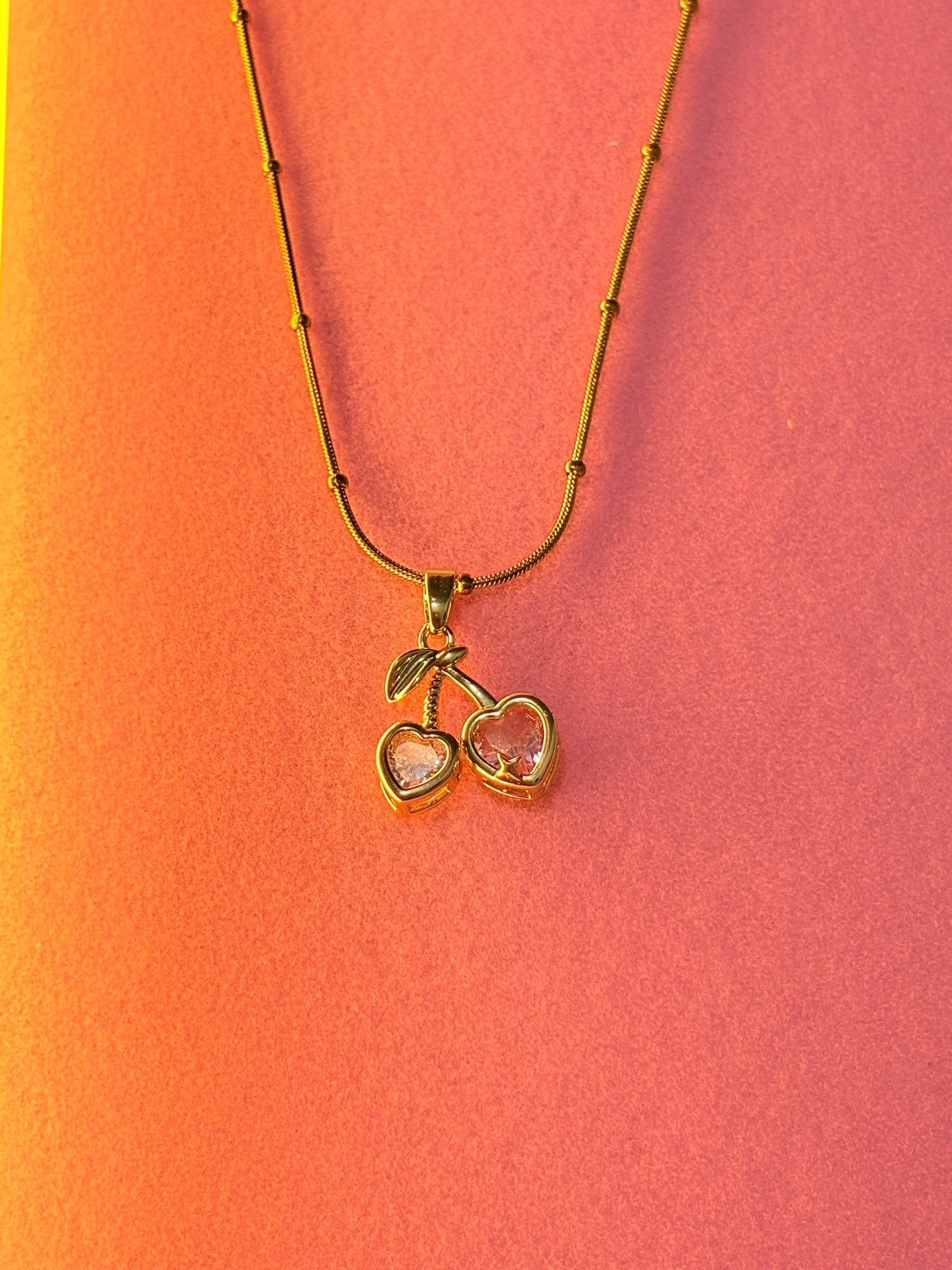 "Add a pop of playful romance with our Cherry Crush Necklace - featuring twin heart-shaped gems that sparkle like sweet love in bloom.